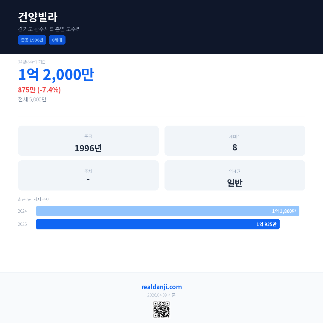 건양빌라 국민평형 기준 2025년 평균 거래가는 1억 925만으로, 전년 대비 7.4% 하락 했습니다.