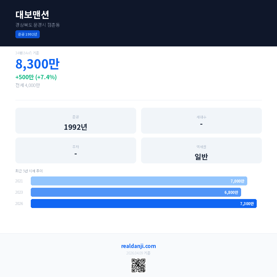 대보맨션 국민평형 기준 2026년 평균 거래가는 7,300만으로, 전년 대비 7.4% 상승 했습니다.
