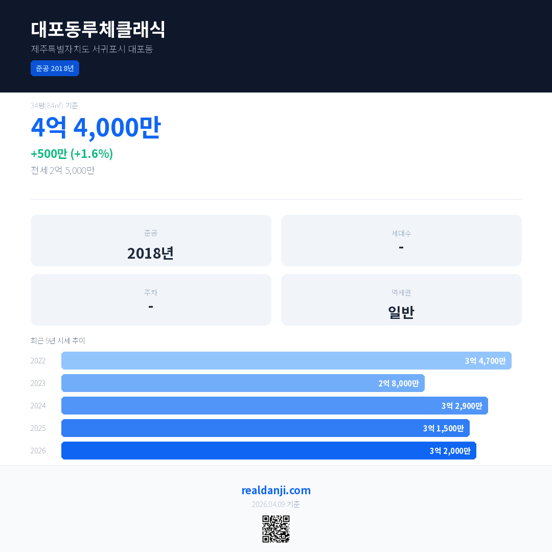 대포동루체클래식 국민평형 기준 2026년 평균 거래가는 3억 2,000만으로, 전년 대비 1.6% 상승 했습니다.
