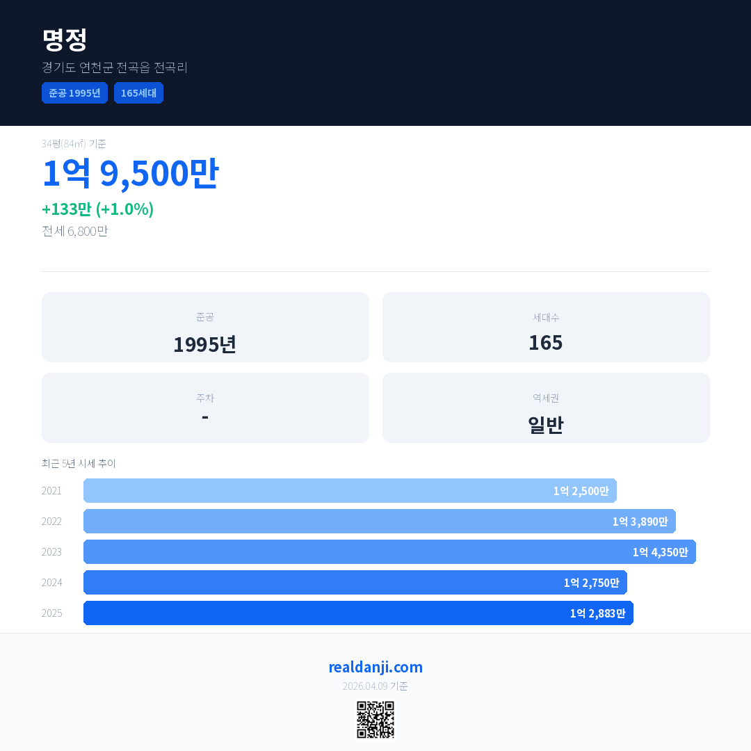 명정 국민평형 기준 2025년 평균 거래가는 1억 2,883만으로, 전년 대비 1.0% 상승 했습니다.