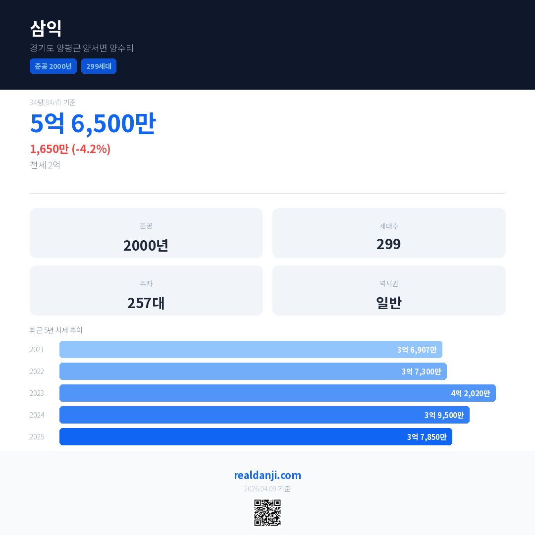 삼익 국민평형 기준 2025년 평균 거래가는 3억 7,850만으로, 전년 대비 4.2% 하락 했습니다.