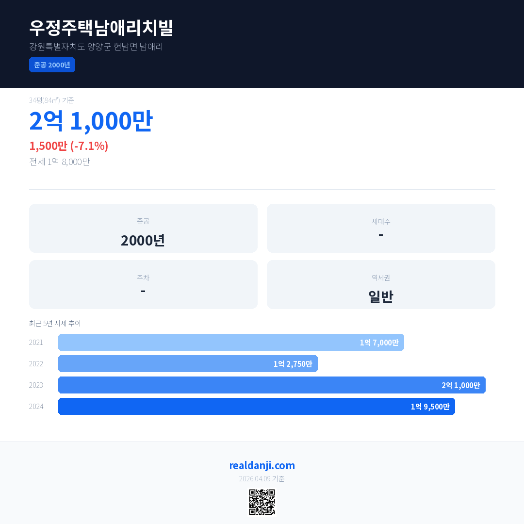 우정주택남애리치빌 최근 거래가는 2억 1,000만입니다. (2024-02)