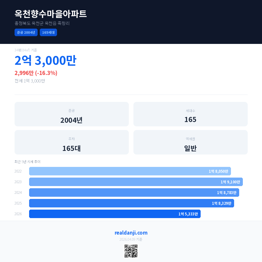 옥천향수마을아파트 최근 거래가는 2억 3,000만입니다. (2026-04)