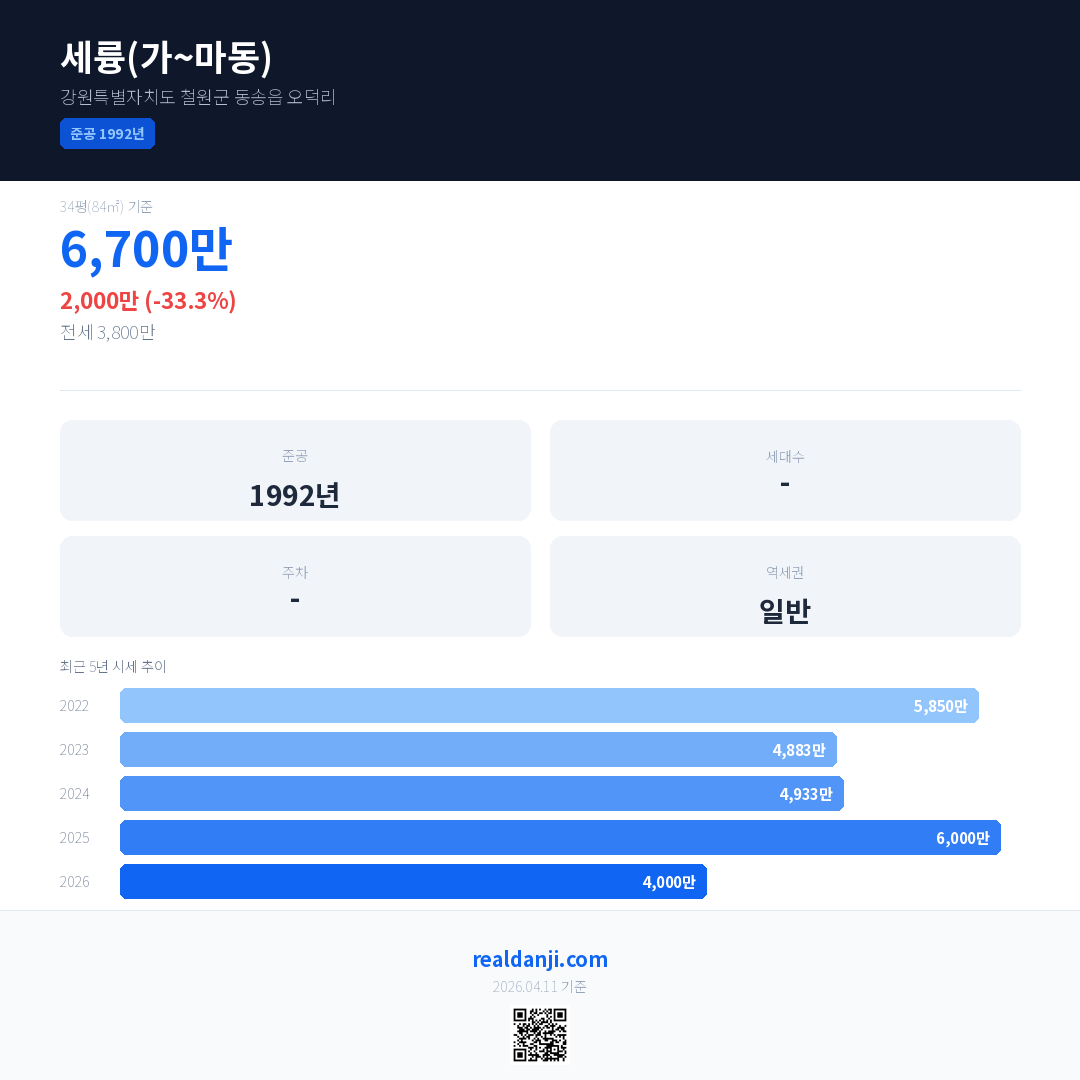 세륭(가~마동) 최근 거래가는 6,700만입니다. (2026-03)