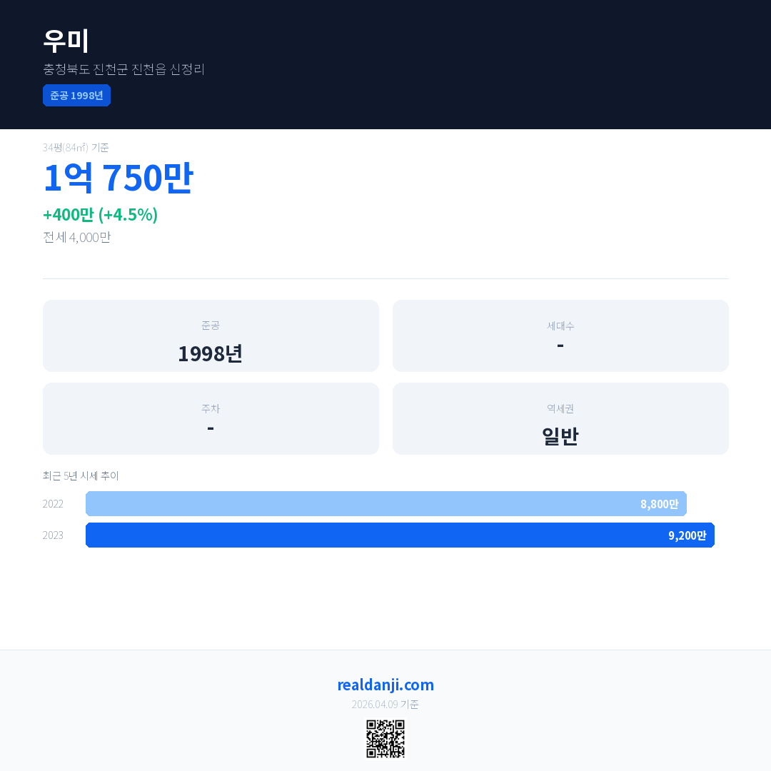 우미 국민평형 기준 2023년 평균 거래가는 9,200만으로, 전년 대비 4.5% 상승 했습니다.