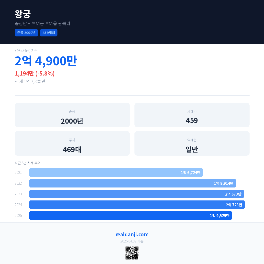 왕궁 국민평형 기준 2025년 평균 거래가는 1억 9,529만으로, 전년 대비 5.8% 하락 했습니다.