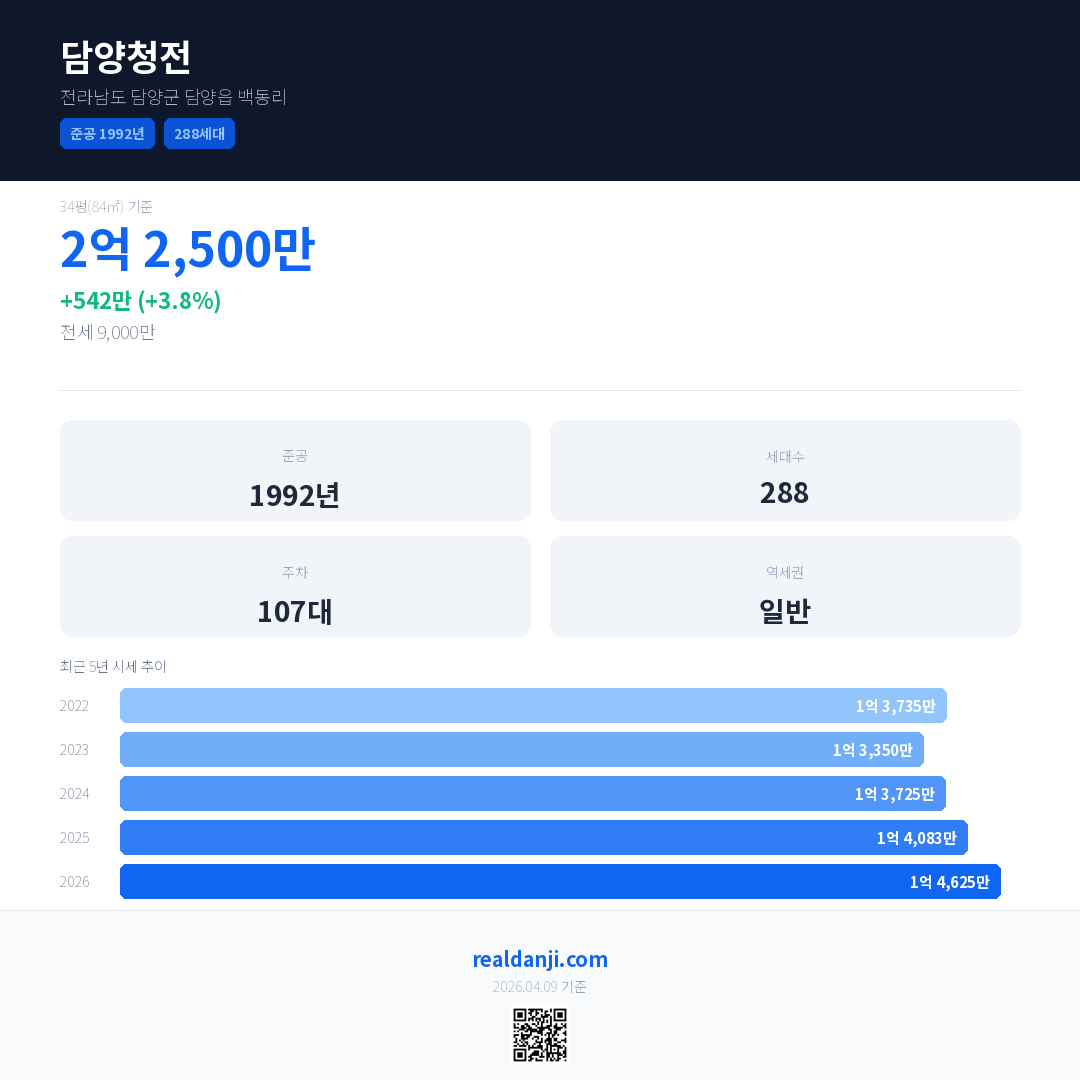담양청전 최근 거래가는 1억 3,500만입니다. (2026-03)