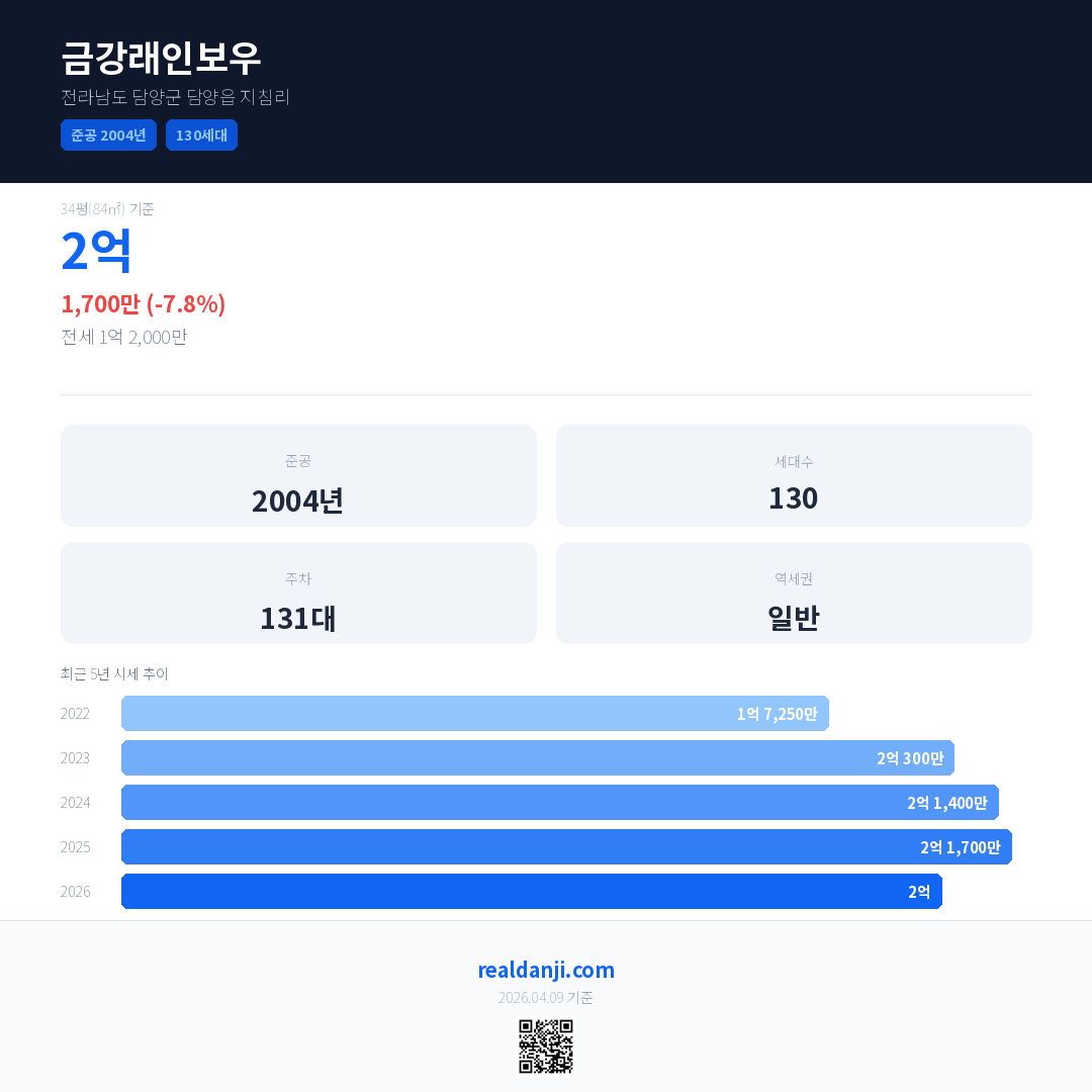 금강래인보우 국민평형 기준 2026년 평균 거래가는 2억으로, 전년 대비 7.8% 하락 했습니다.