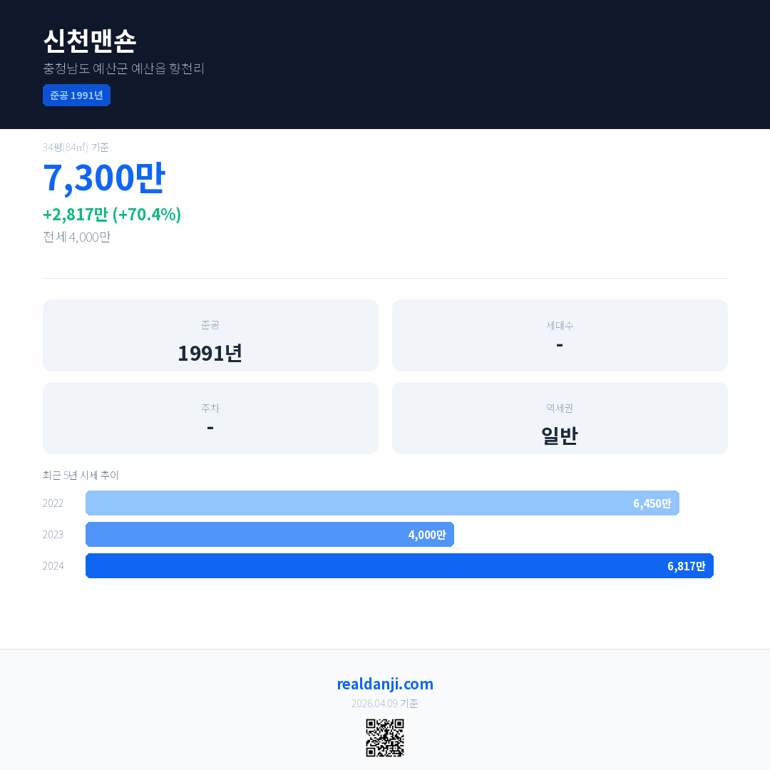 신천맨숀 최근 거래가는 7,300만입니다. (2024-09)