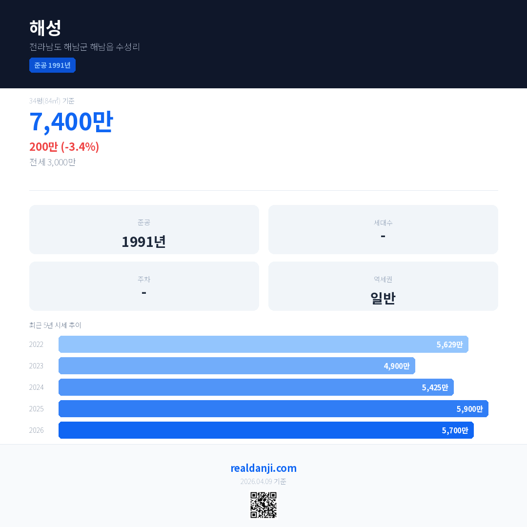 해성 국민평형 기준 2026년 평균 거래가는 5,700만으로, 전년 대비 3.4% 하락 했습니다.