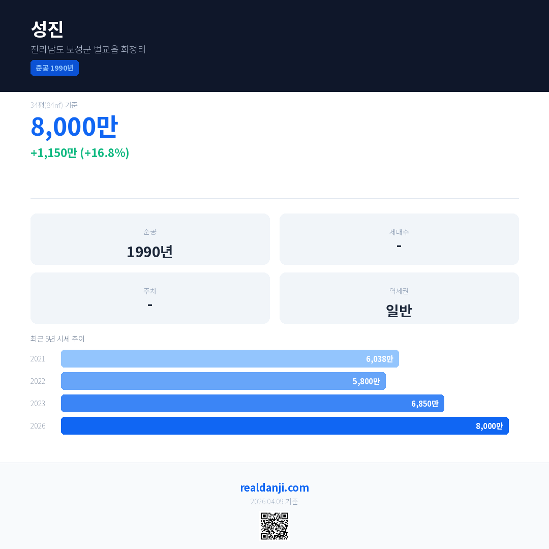 성진 국민평형 기준 2026년 평균 거래가는 8,000만으로, 전년 대비 16.8% 상승 했습니다.