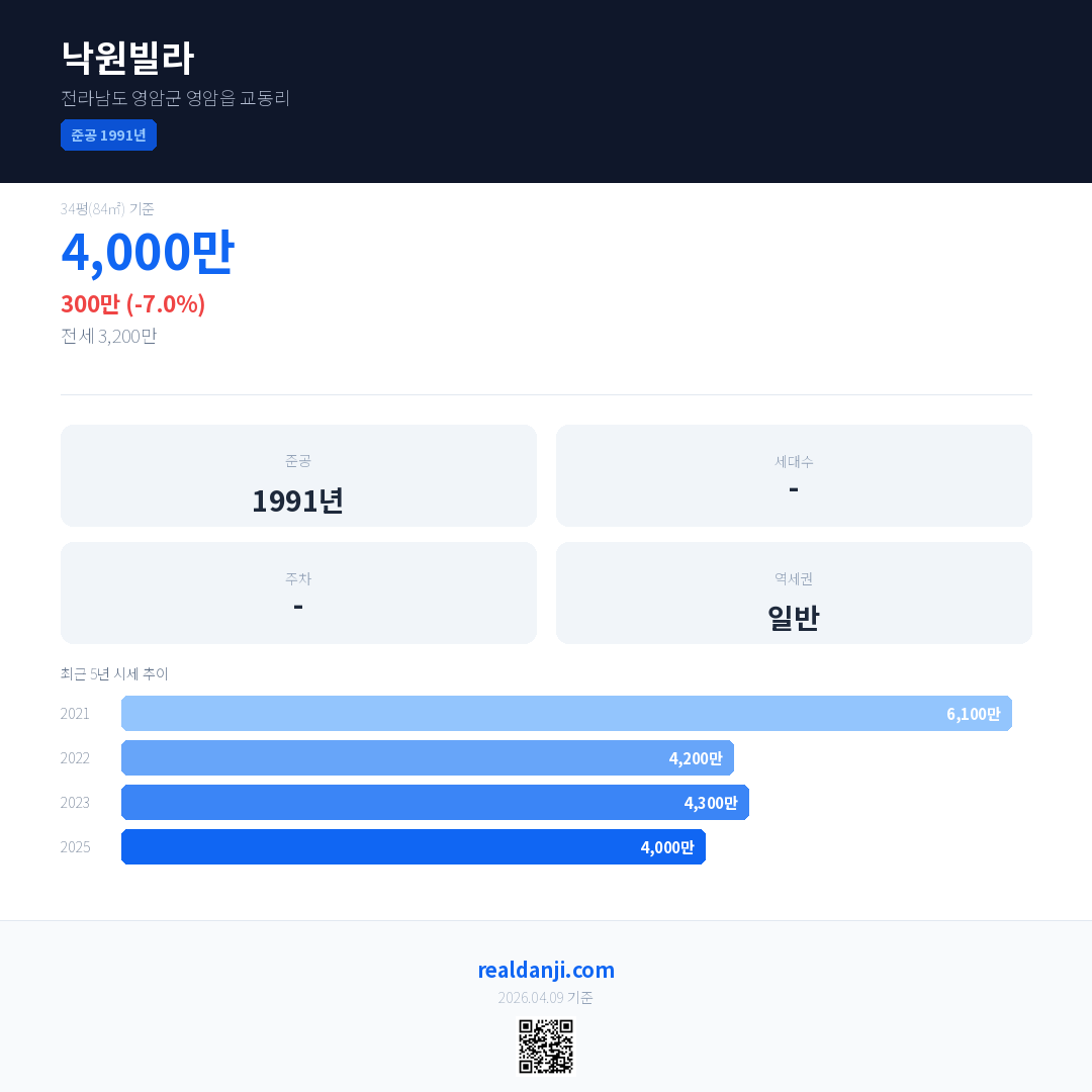 낙원빌라 국민평형 기준 2025년 평균 거래가는 4,000만으로, 전년 대비 7.0% 하락 했습니다.