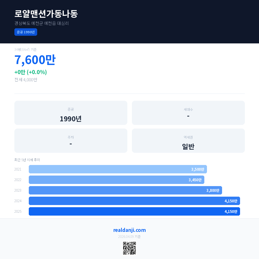로얄맨션가동나동 국민평형 기준 2025년 평균 거래가는 4,150만으로, 전년 대비 0.0% 하락 했습니다.