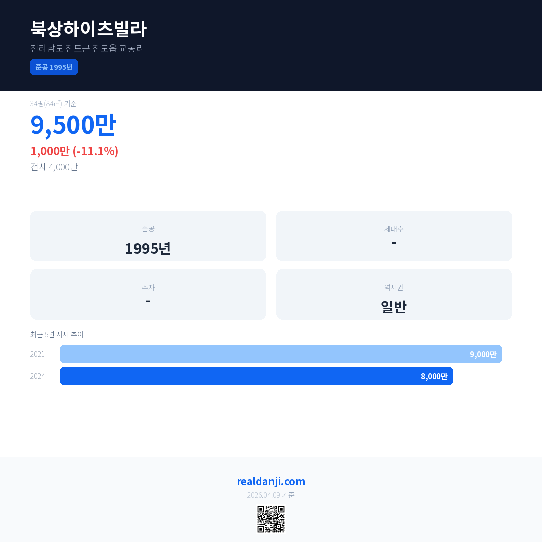 북상하이츠빌라 최근 거래가는 9,500만입니다. (2024-02)
