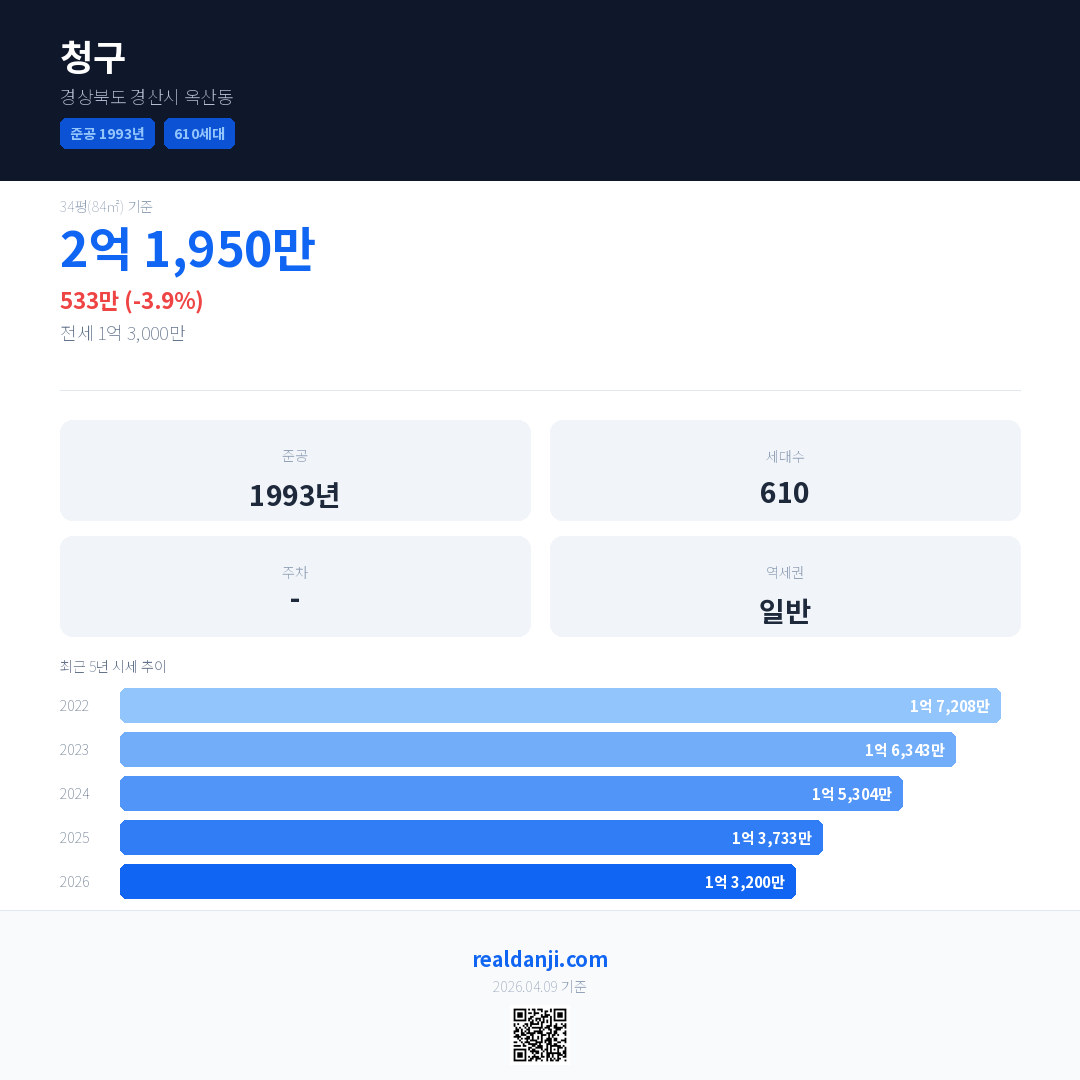 청구은(는) 1993년에 준공되었으며, 현재 33년차입니다. 총 610세대 규모입니다.