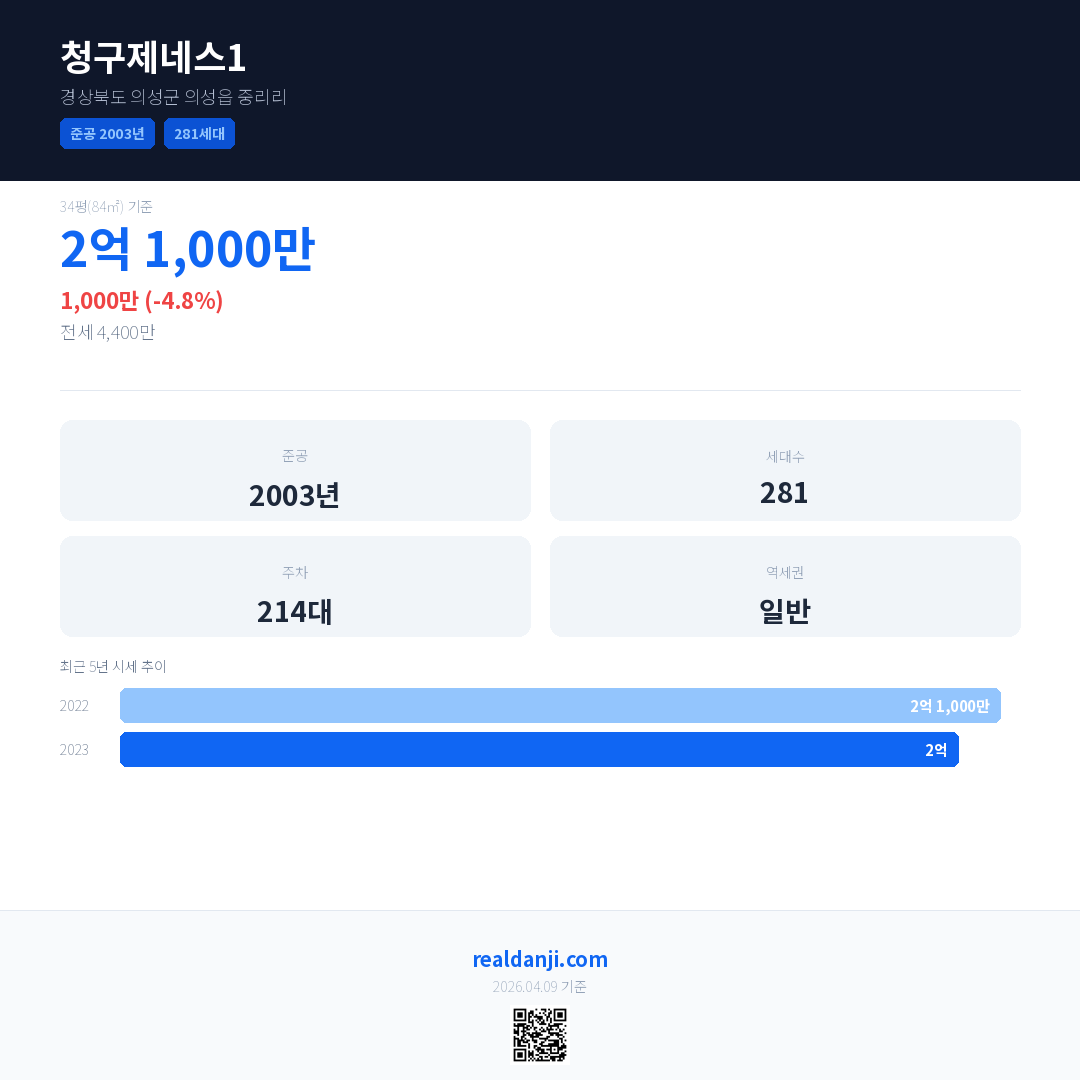 청구제네스1 국민평형 기준 2023년 평균 거래가는 2억으로, 전년 대비 4.8% 하락 했습니다.