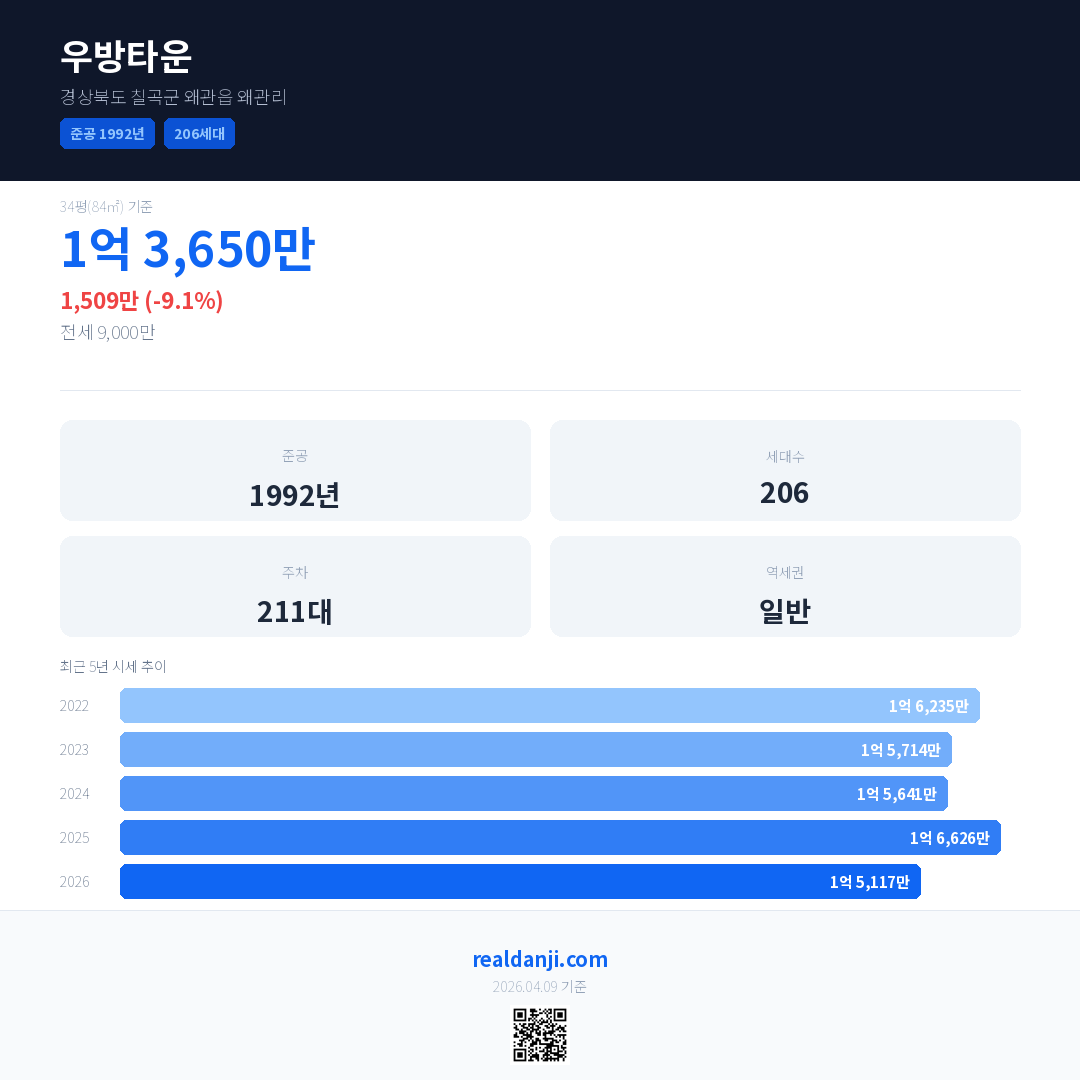 우방타운 국민평형 기준 2026년 평균 거래가는 1억 5,117만으로, 전년 대비 9.1% 하락 했습니다.