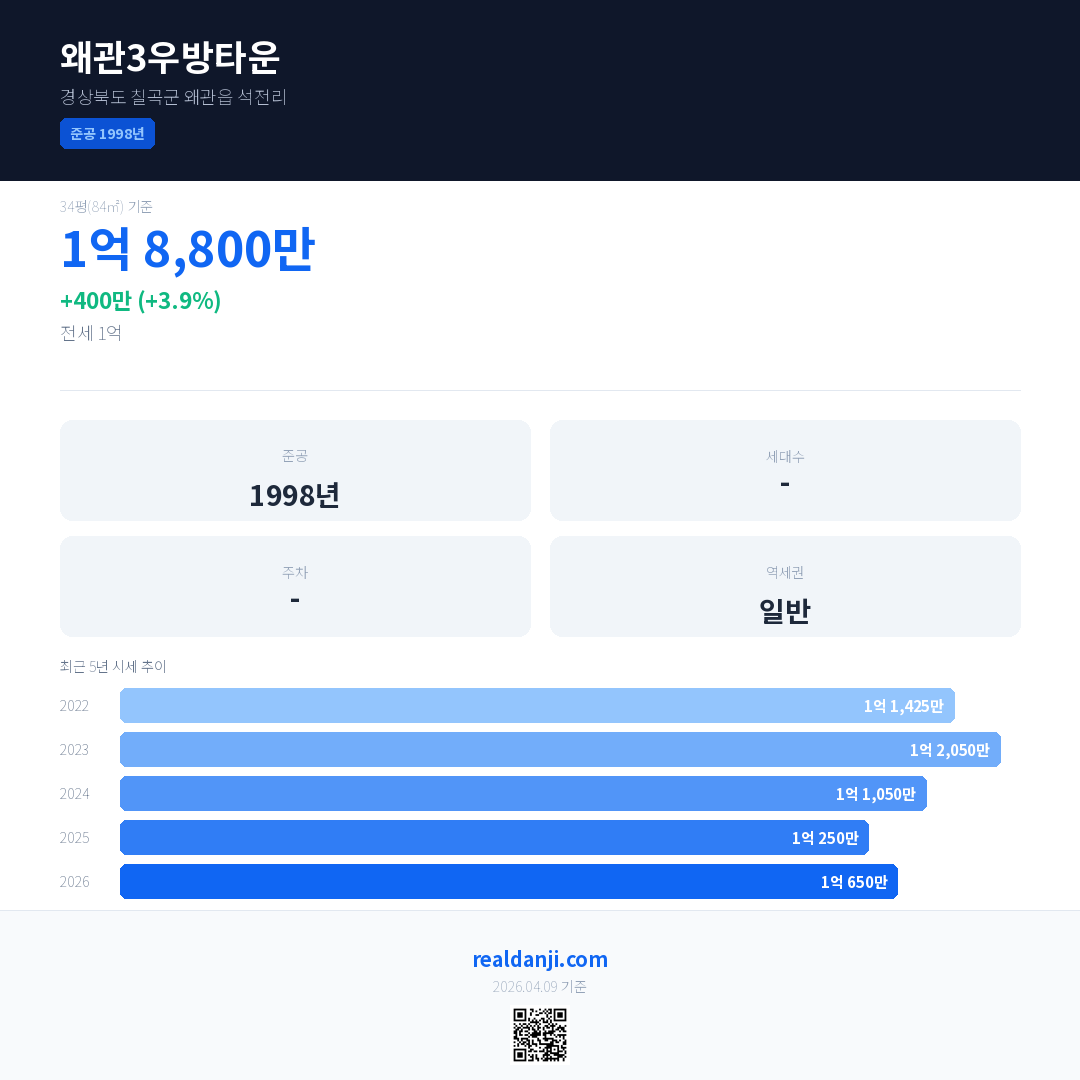 왜관3우방타운 국민평형 기준 2026년 평균 거래가는 1억 650만으로, 전년 대비 3.9% 상승 했습니다.