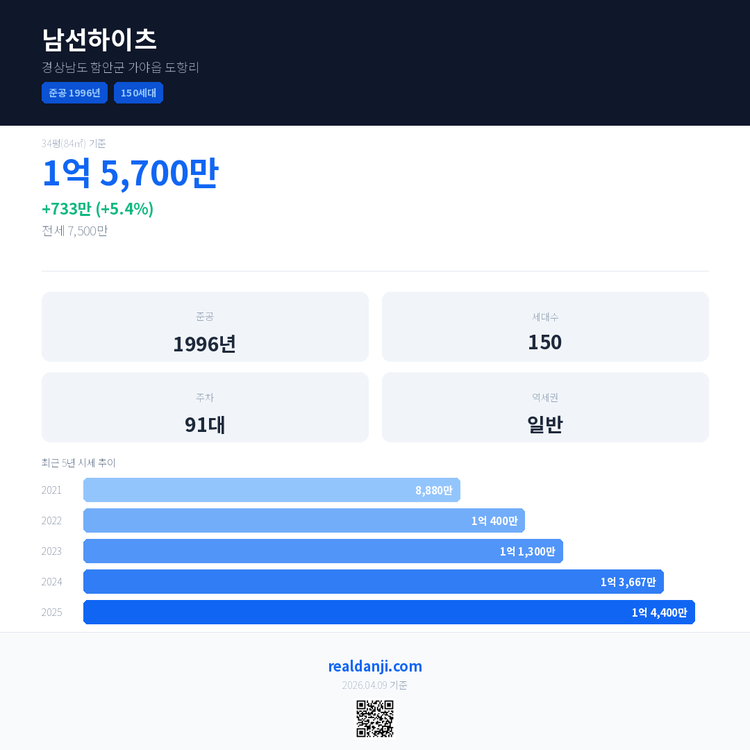 남선하이츠 국민평형 기준 2025년 평균 거래가는 1억 4,400만으로, 전년 대비 5.4% 상승 했습니다.