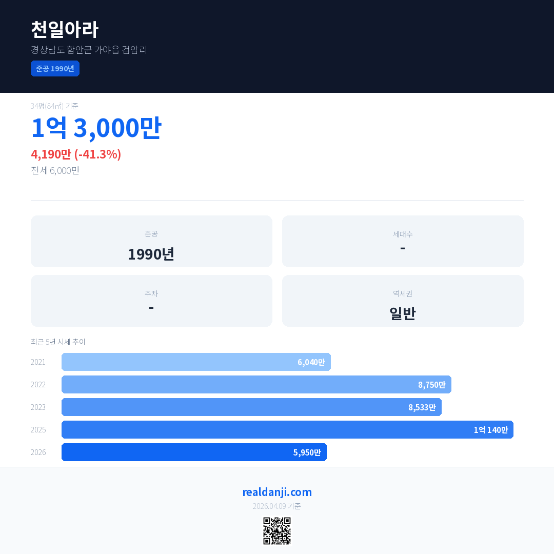 천일아라 국민평형 기준 2026년 평균 거래가는 5,950만으로, 전년 대비 41.3% 하락 했습니다.