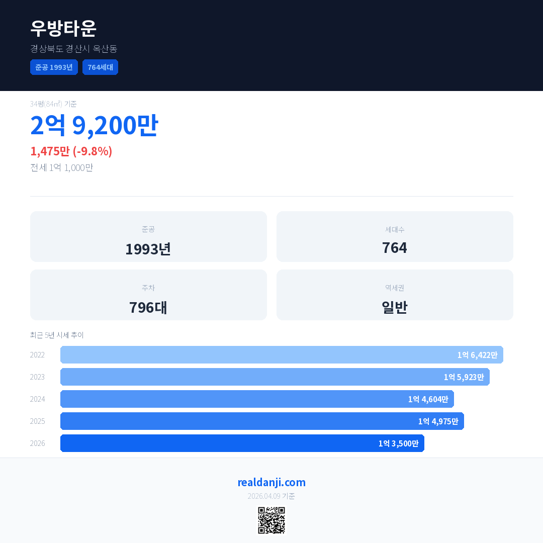우방타운 국민평형 기준 2026년 평균 거래가는 1억 3,500만으로, 전년 대비 9.8% 하락 했습니다.