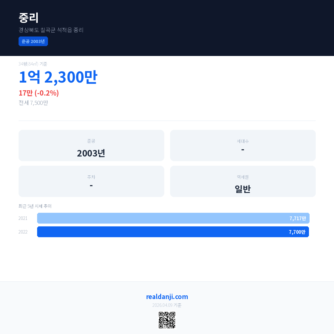 중리 국민평형 기준 2022년 평균 거래가는 7,700만으로, 전년 대비 0.2% 하락 했습니다.