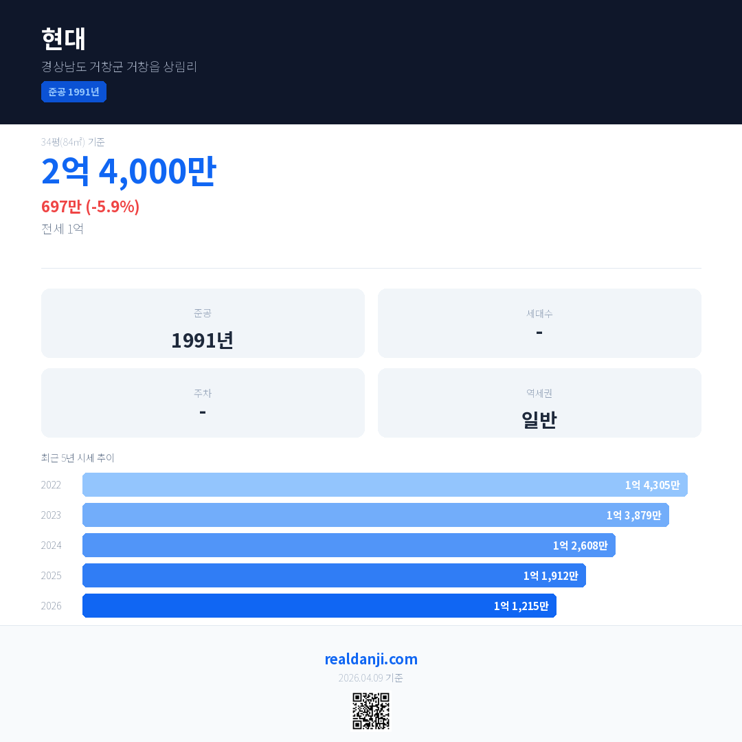 현대 국민평형 기준 2026년 평균 거래가는 1억 1,215만으로, 전년 대비 5.9% 하락 했습니다.
