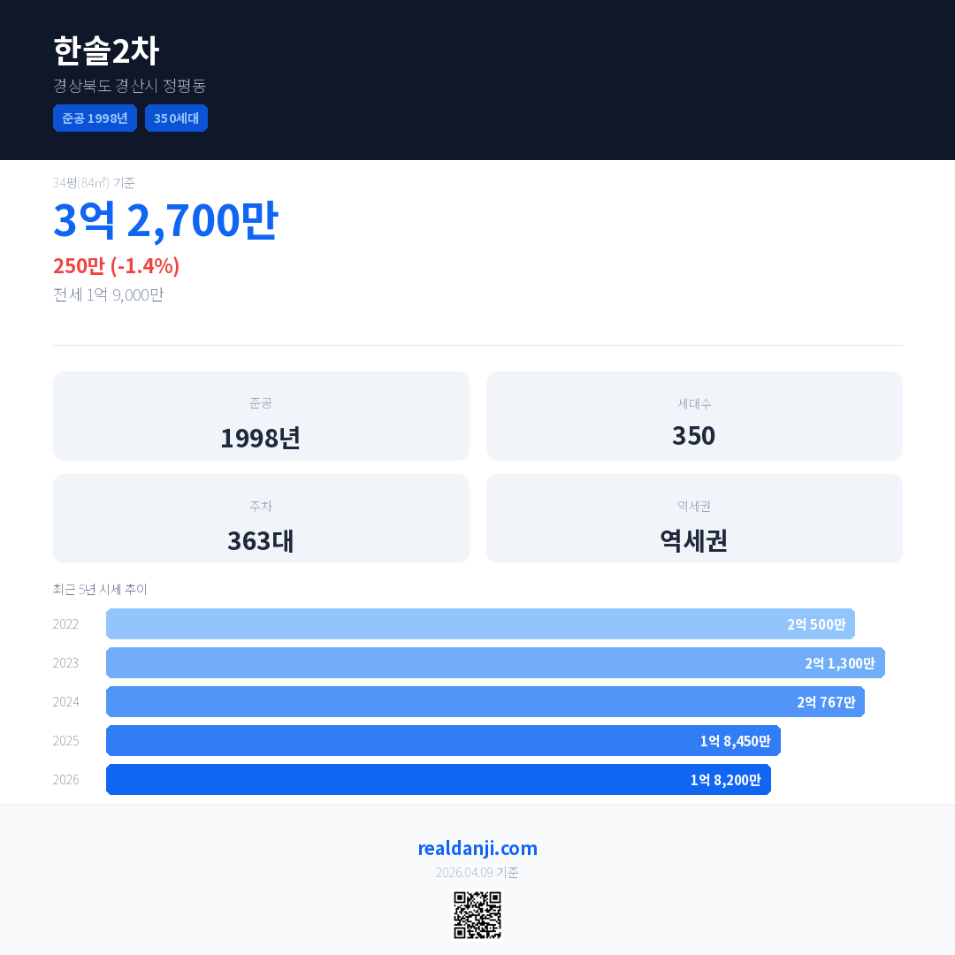 한솔2차은(는) 1998년에 준공되었으며, 현재 28년차입니다. 총 350세대 규모입니다.