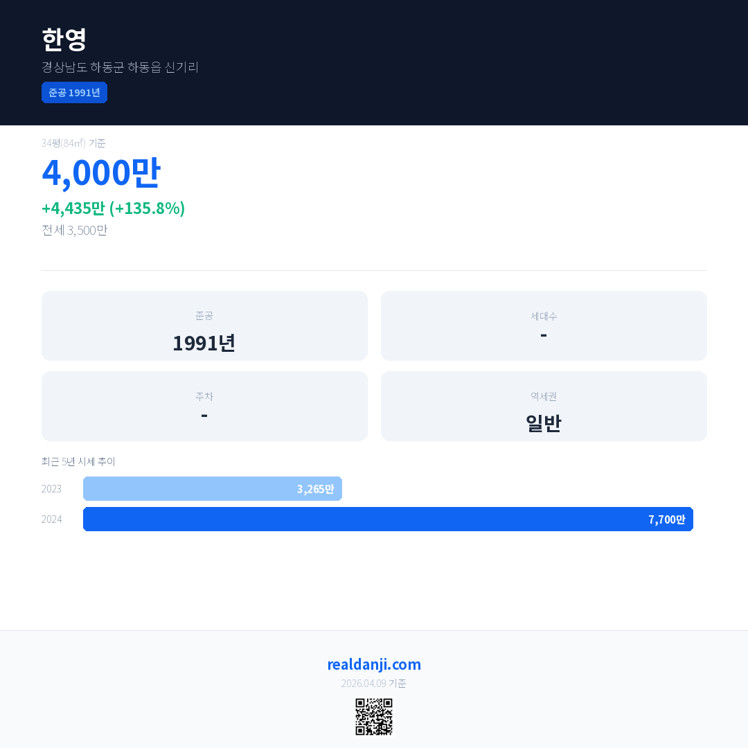 한영 국민평형 기준 2024년 평균 거래가는 7,700만으로, 전년 대비 135.8% 상승 했습니다.