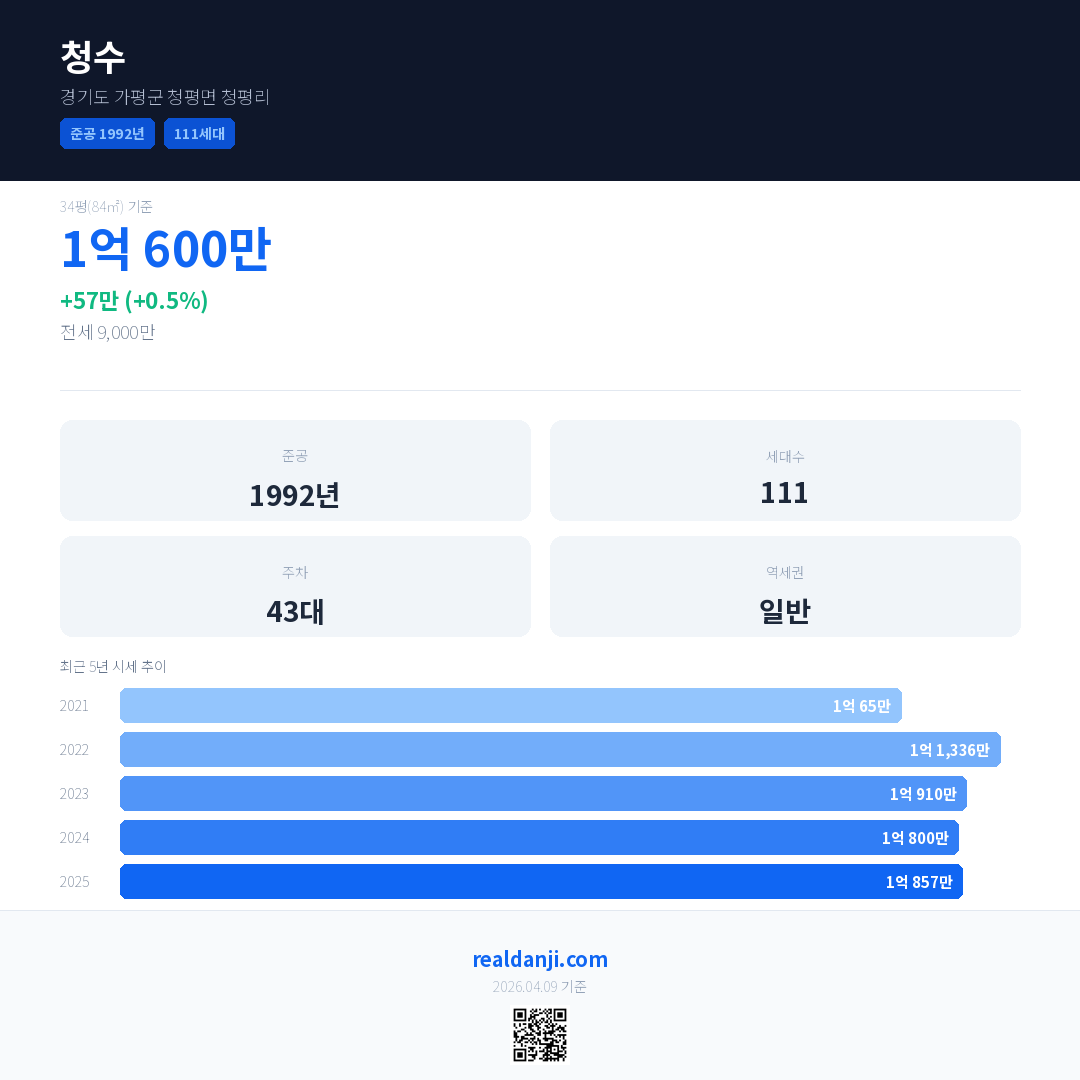 청수 국민평형 기준 2025년 평균 거래가는 1억 857만으로, 전년 대비 0.5% 상승 했습니다.
