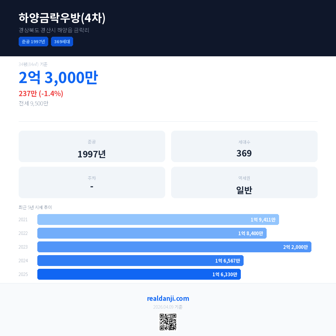 하양금락우방(4차) 최근 거래가는 2억 3,000만입니다. (2026-04)