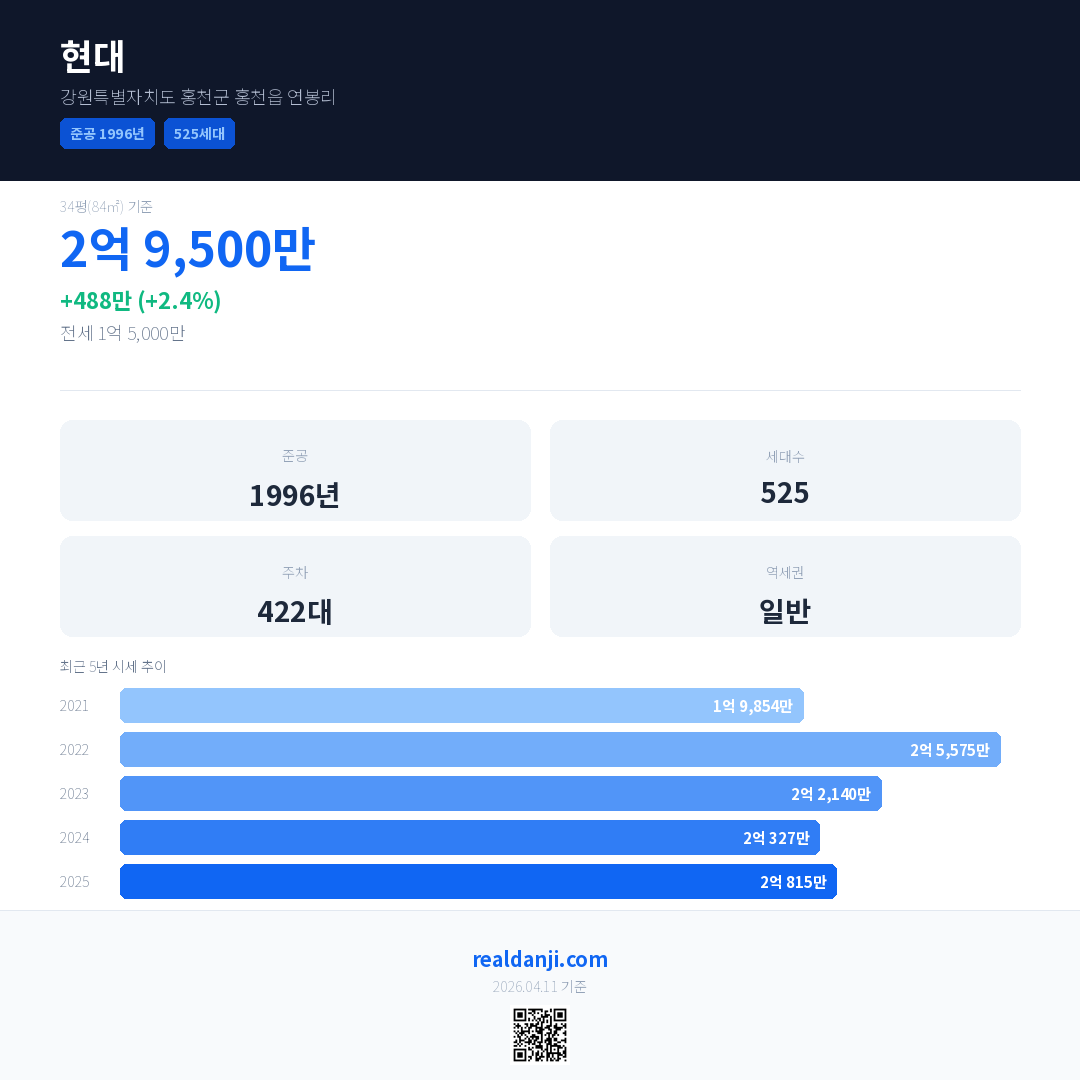 현대 국민평형 기준 2025년 평균 거래가는 2억 815만으로, 전년 대비 2.4% 상승 했습니다.