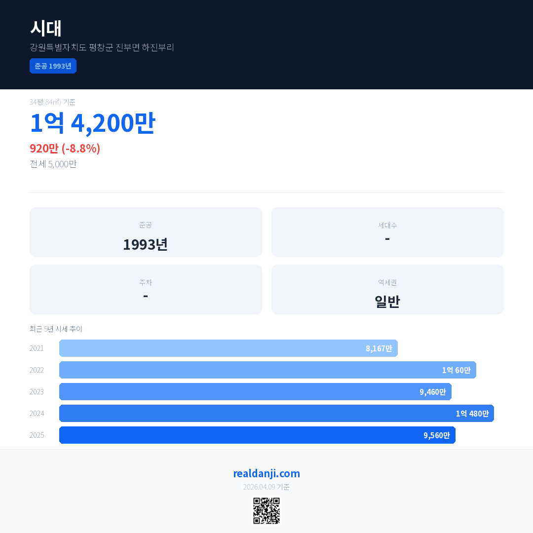 시대 국민평형 기준 2025년 평균 거래가는 9,560만으로, 전년 대비 8.8% 하락 했습니다.