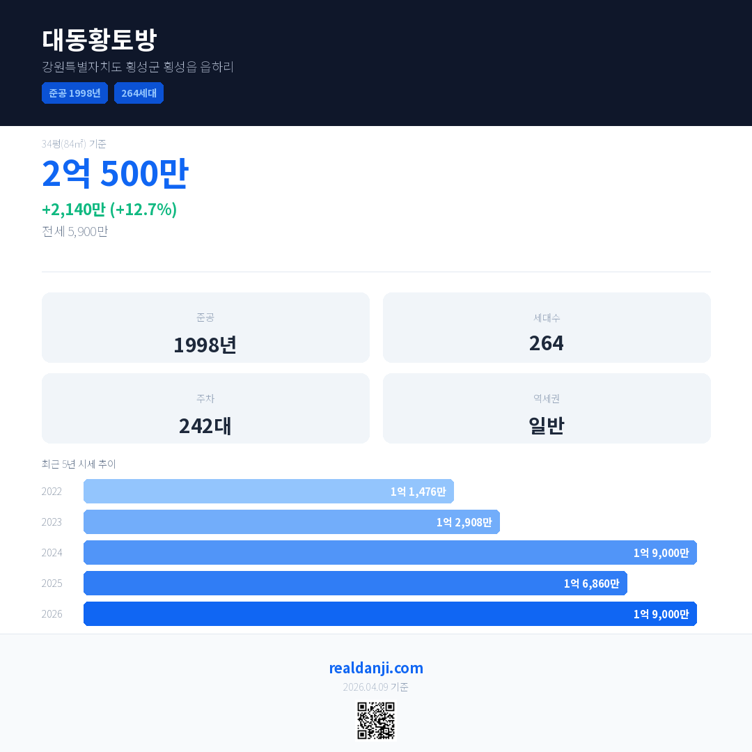 대동황토방 국민평형 기준 2026년 평균 거래가는 1억 9,000만으로, 전년 대비 12.7% 상승 했습니다.