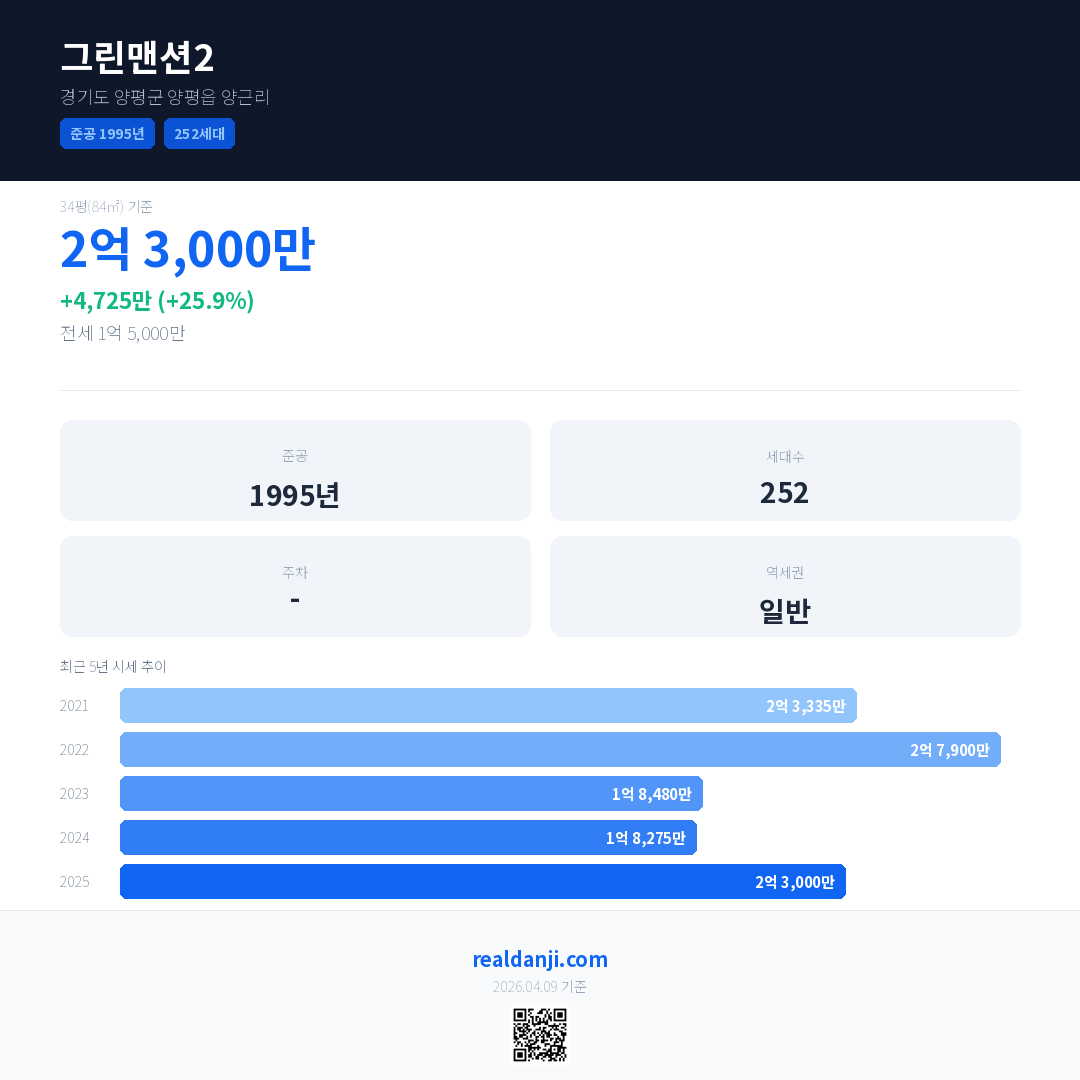그린맨션2 국민평형 기준 2025년 평균 거래가는 2억 3,000만으로, 전년 대비 25.9% 상승 했습니다.