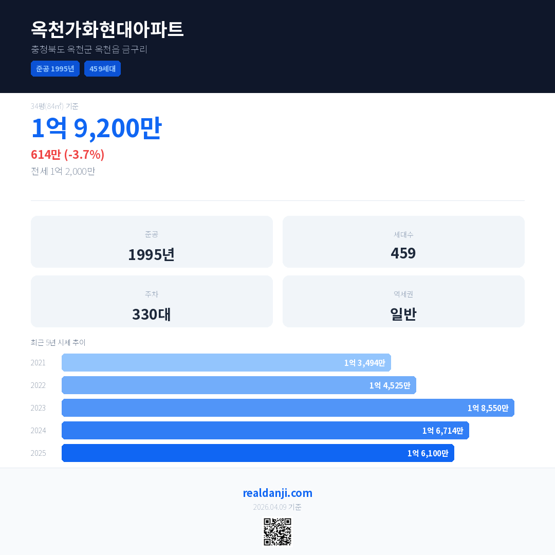 옥천가화현대아파트 최근 거래가는 1억 9,200만입니다. (2026-02)