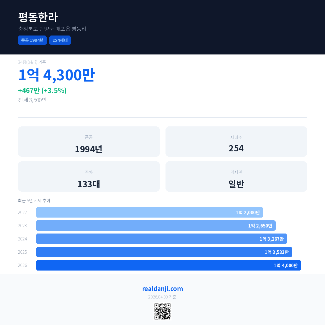 평동한라 국민평형 기준 2026년 평균 거래가는 1억 4,000만으로, 전년 대비 3.5% 상승 했습니다.