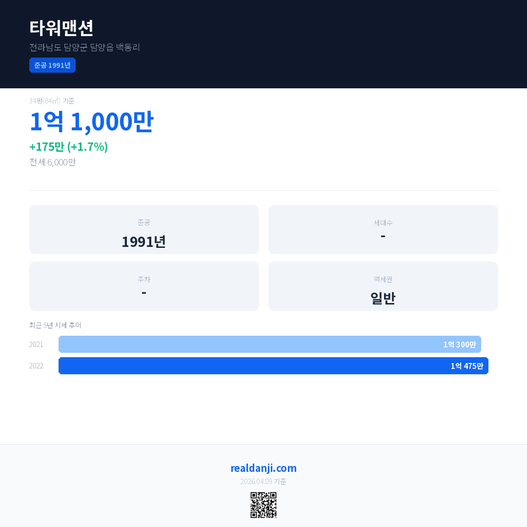 타워맨션은(는) 1991년에 준공되었으며, 현재 35년차입니다.