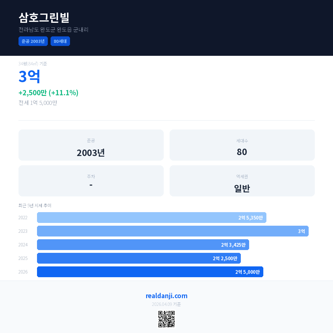 삼호그린빌 국민평형 기준 2026년 평균 거래가는 2억 5,000만으로, 전년 대비 11.1% 상승 했습니다.