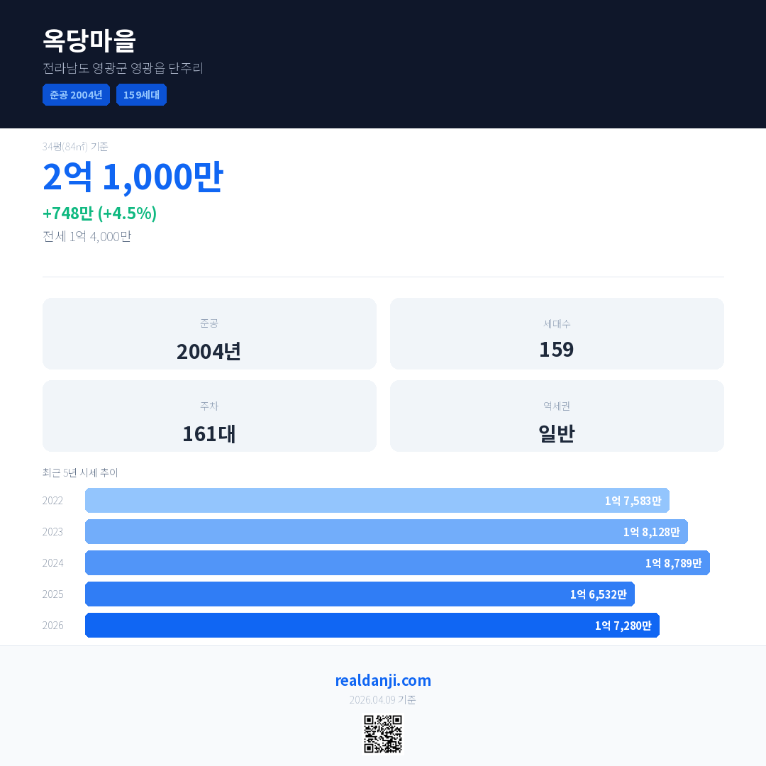 옥당마을 국민평형 기준 2026년 평균 거래가는 1억 7,280만으로, 전년 대비 4.5% 상승 했습니다.