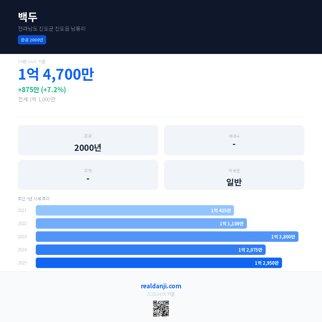 백두 국민평형 기준 2025년 평균 거래가는 1억 2,950만으로, 전년 대비 7.2% 상승 했습니다.