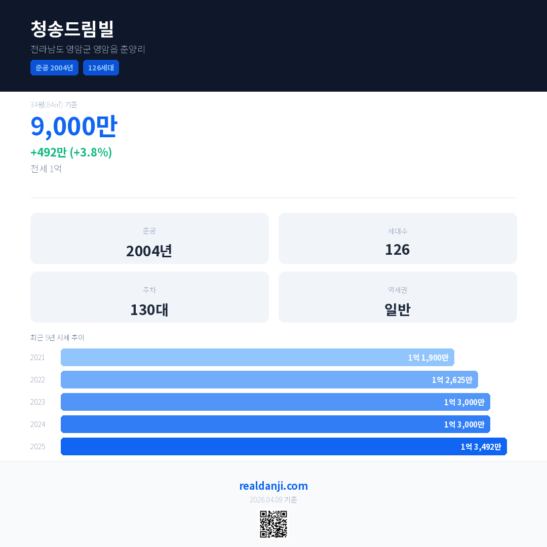 청송드림빌 국민평형 기준 2025년 평균 거래가는 1억 3,492만으로, 전년 대비 3.8% 상승 했습니다.