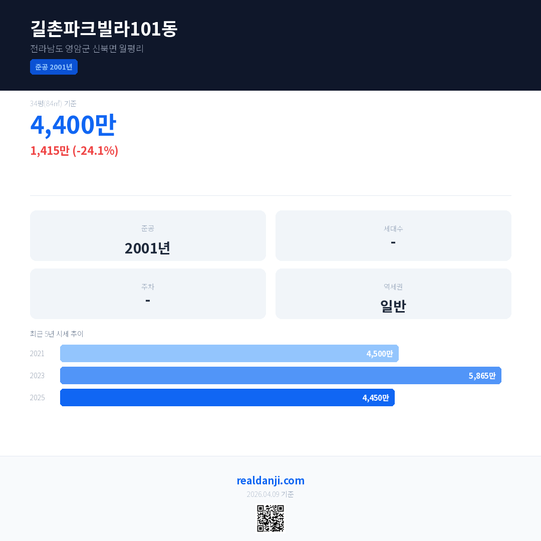 길촌파크빌라101동 국민평형 기준 2025년 평균 거래가는 4,450만으로, 전년 대비 24.1% 하락 했습니다.