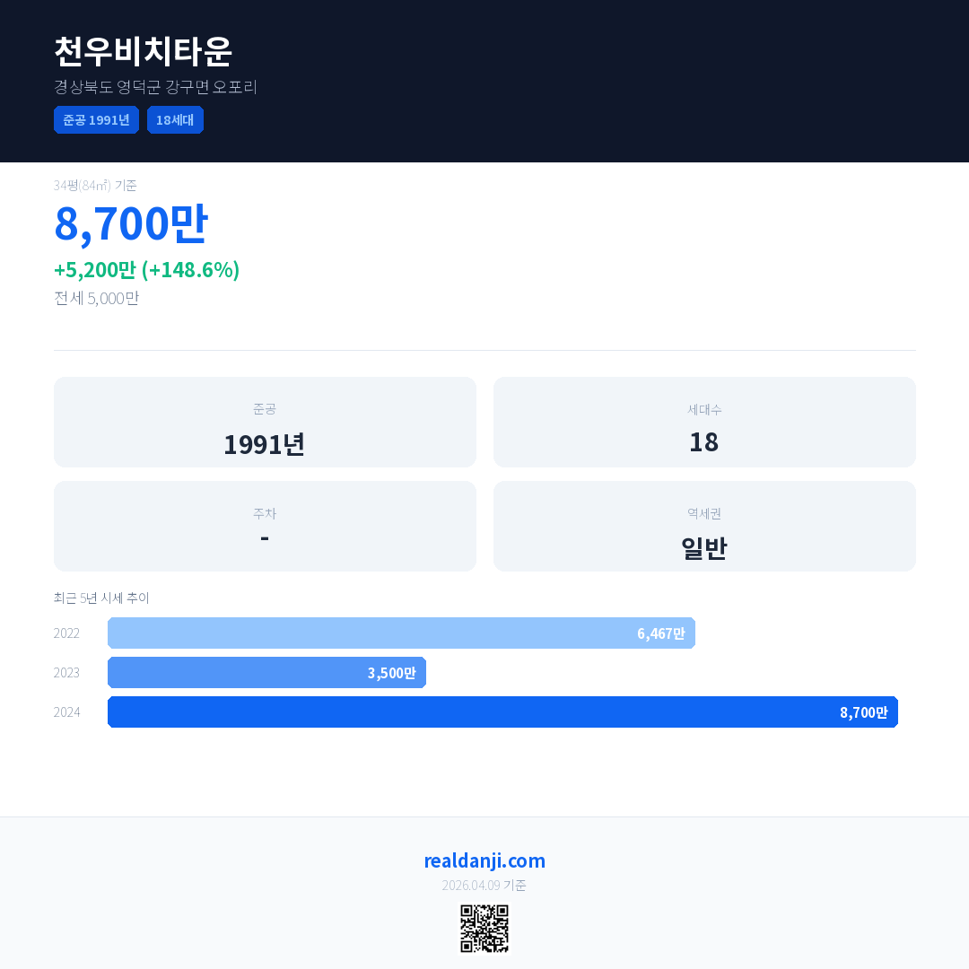 천우비치타운 최근 거래가는 8,700만입니다. (2024-07)