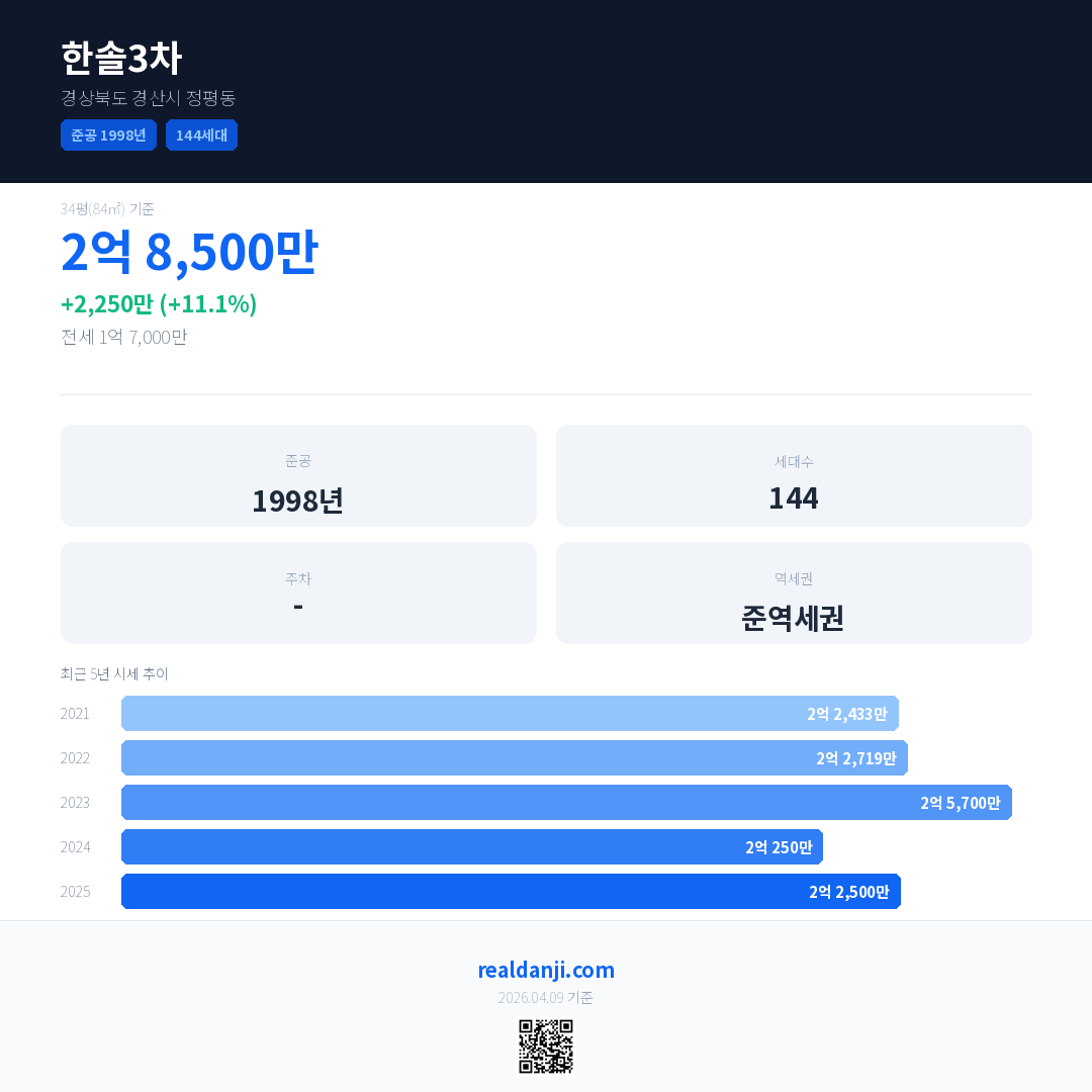 한솔3차 최근 거래가는 2억 8,500만입니다. (2025-03)