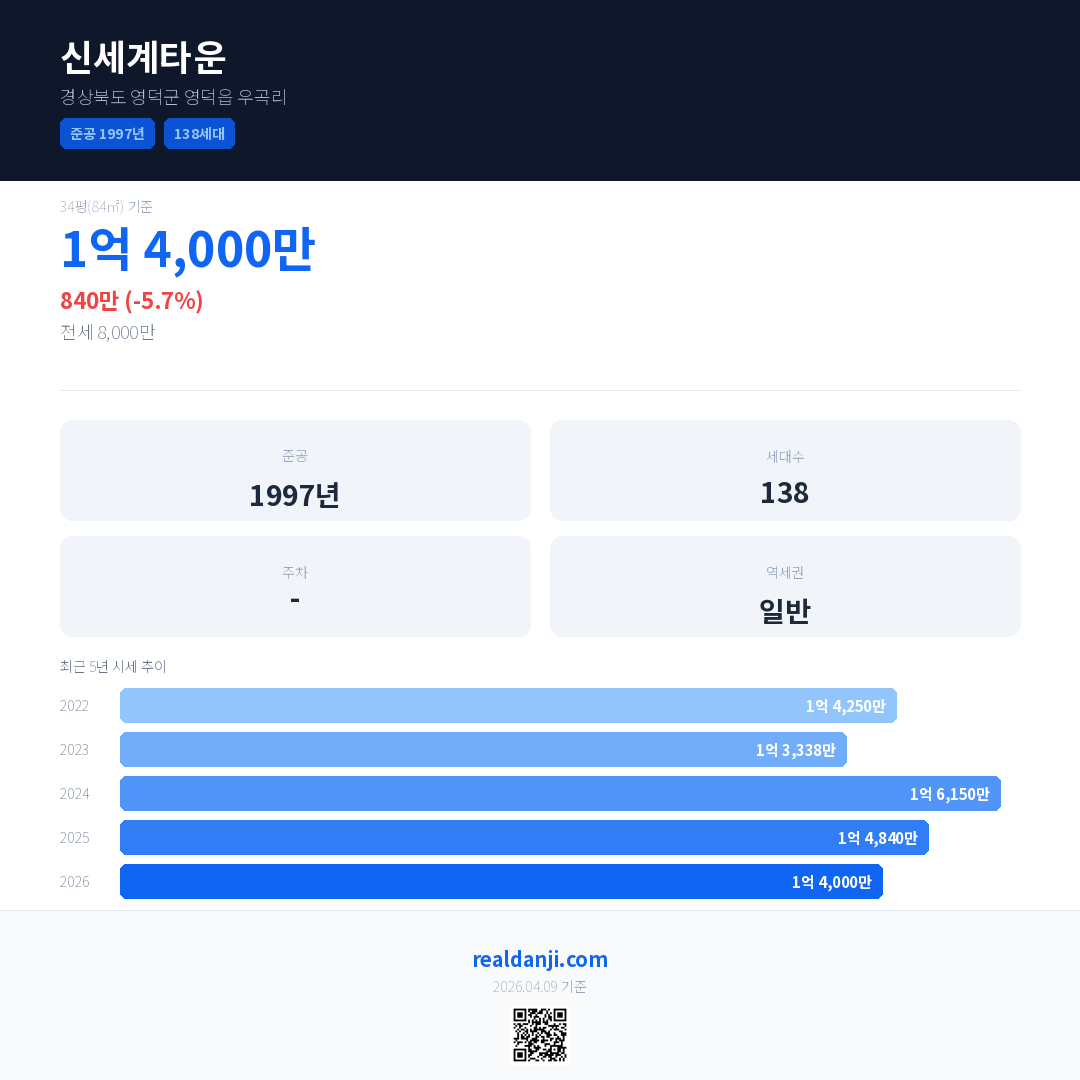 신세계타운 국민평형 기준 2026년 평균 거래가는 1억 4,000만으로, 전년 대비 5.7% 하락 했습니다.