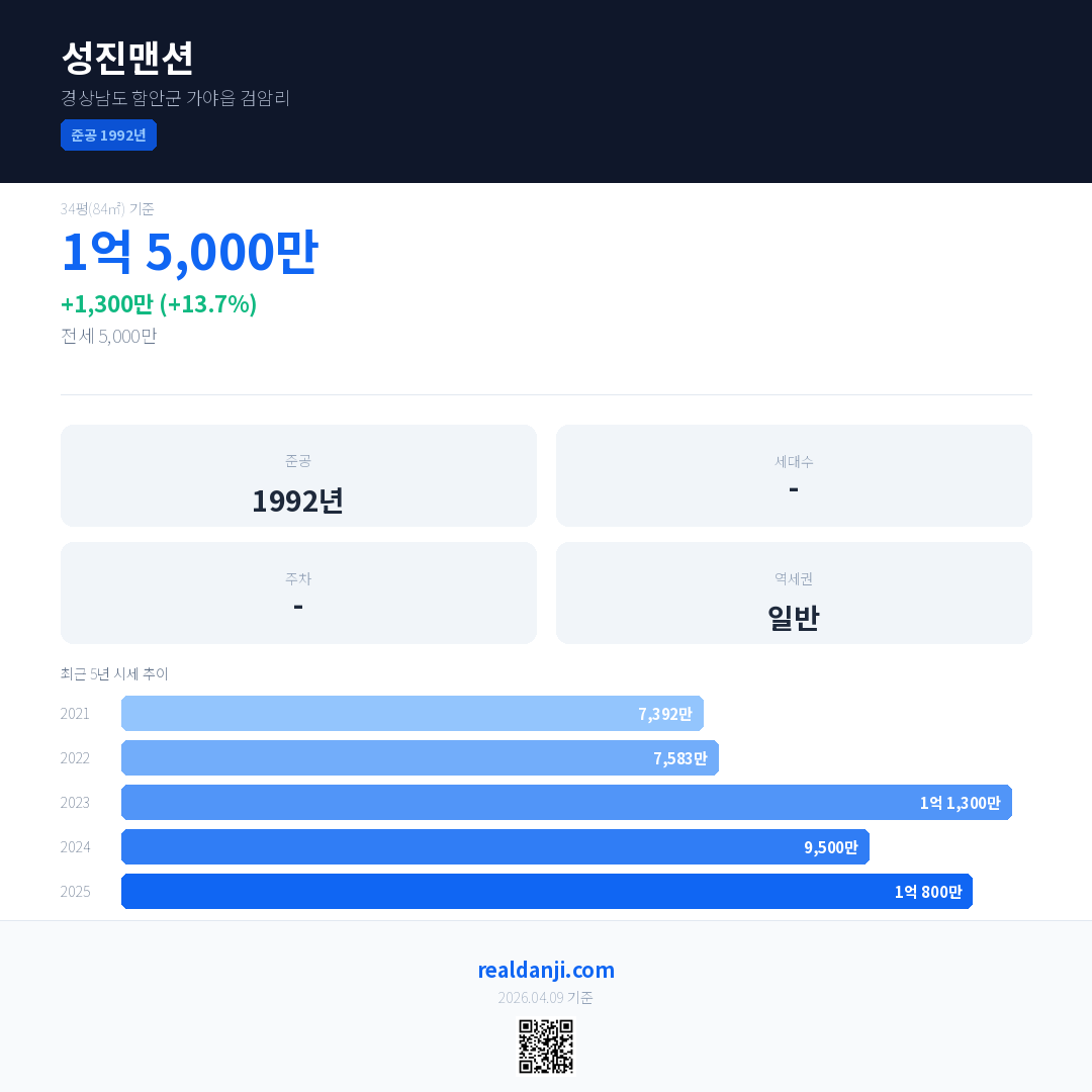 성진맨션 국민평형 기준 2025년 평균 거래가는 1억 800만으로, 전년 대비 13.7% 상승 했습니다.