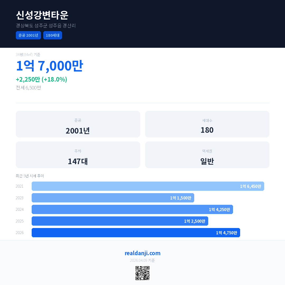 신성강변타운 국민평형 기준 2026년 평균 거래가는 1억 4,750만으로, 전년 대비 18.0% 상승 했습니다.