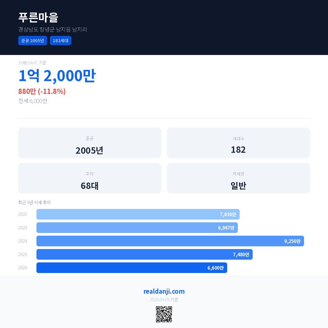 푸른마을 국민평형 기준 2026년 평균 거래가는 6,600만으로, 전년 대비 11.8% 하락 했습니다.