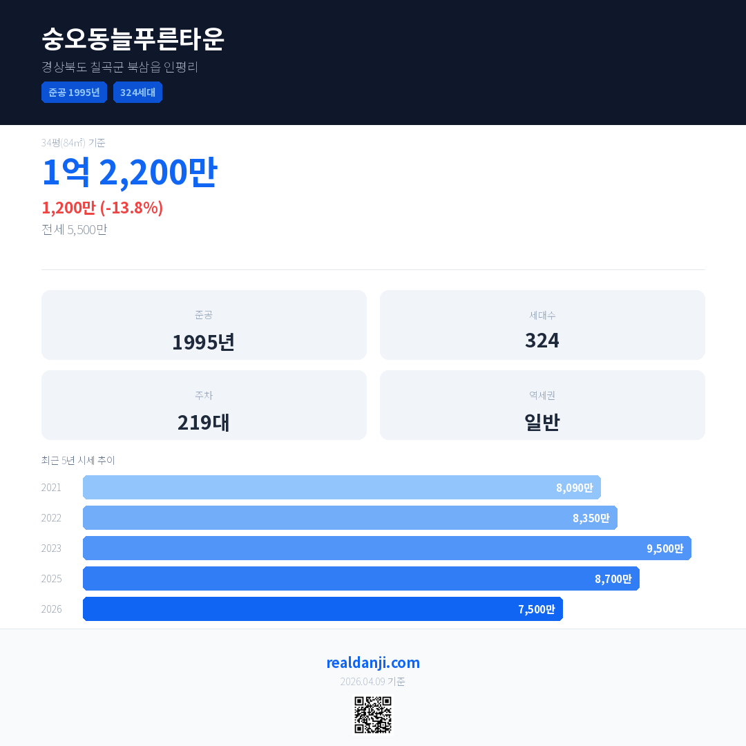 숭오동늘푸른타운 최근 거래가는 1억 2,200만입니다. (2026-03)